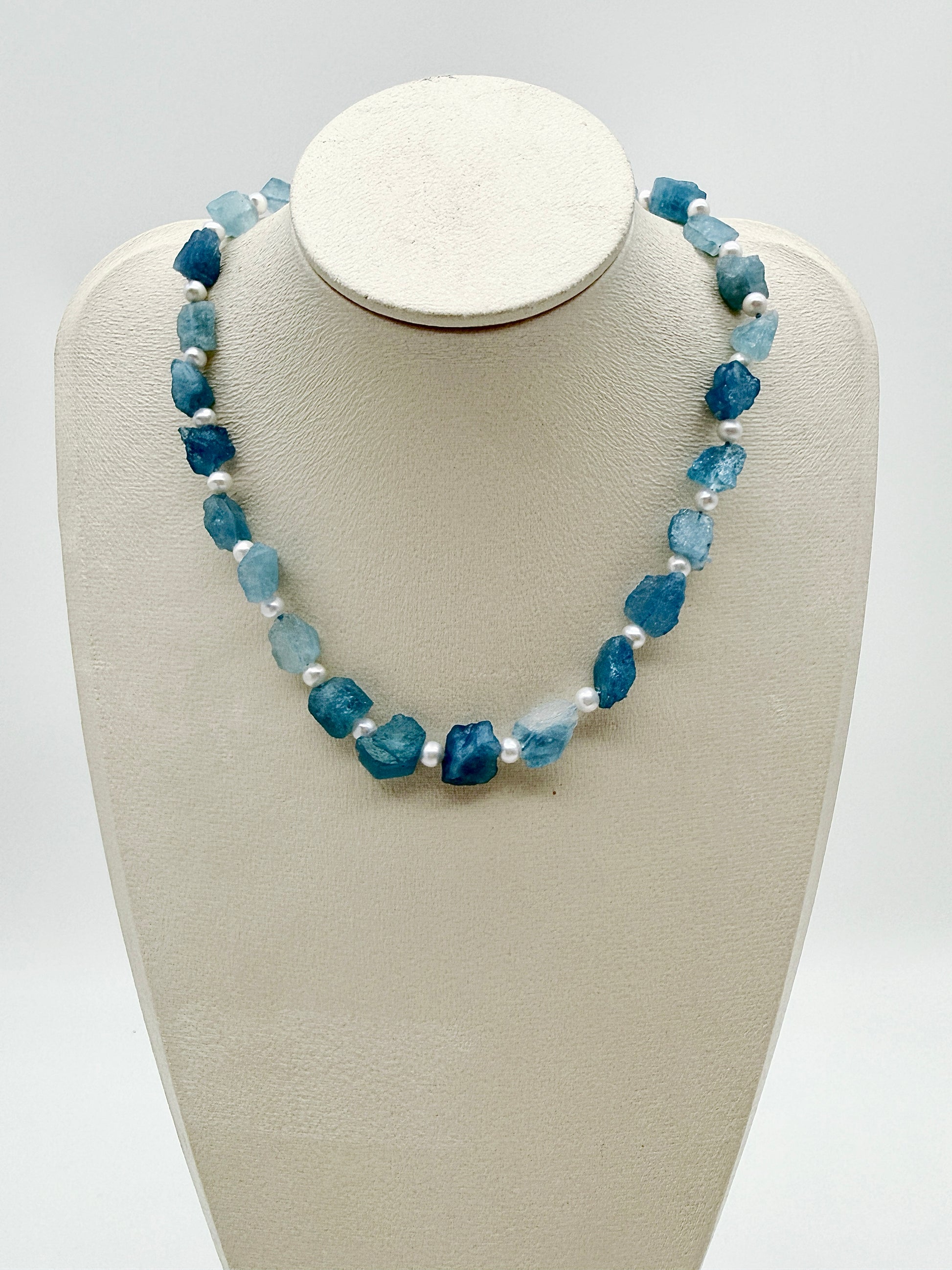 Embrace modern elegance with this enchanting freshwater pearl and aquamarine necklace, a captivating new addition to our collection. This piece masterfully blends the luminous, organic beauty of genuine freshwater pearls with the serene, crystalline sparkle of aquamarine, creating a delicate yet distinctive handcrafted statement piece designed to fit you perfectly.
