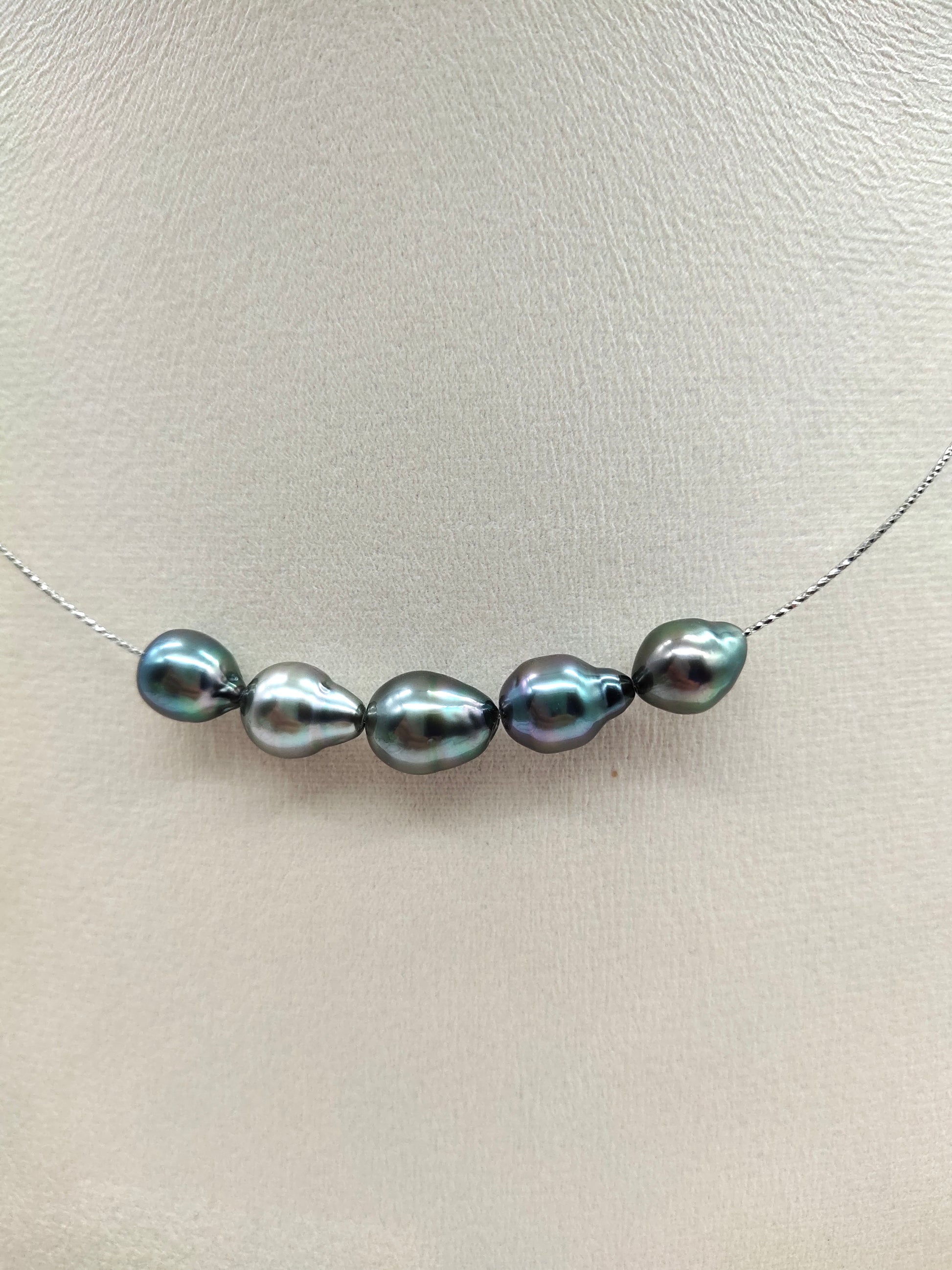 A beautiful new style in our necklace collection. These unique pearls display intense natural colours which are exquisite and varied under different light and angles. The pearl measures approximately 9.5mm.